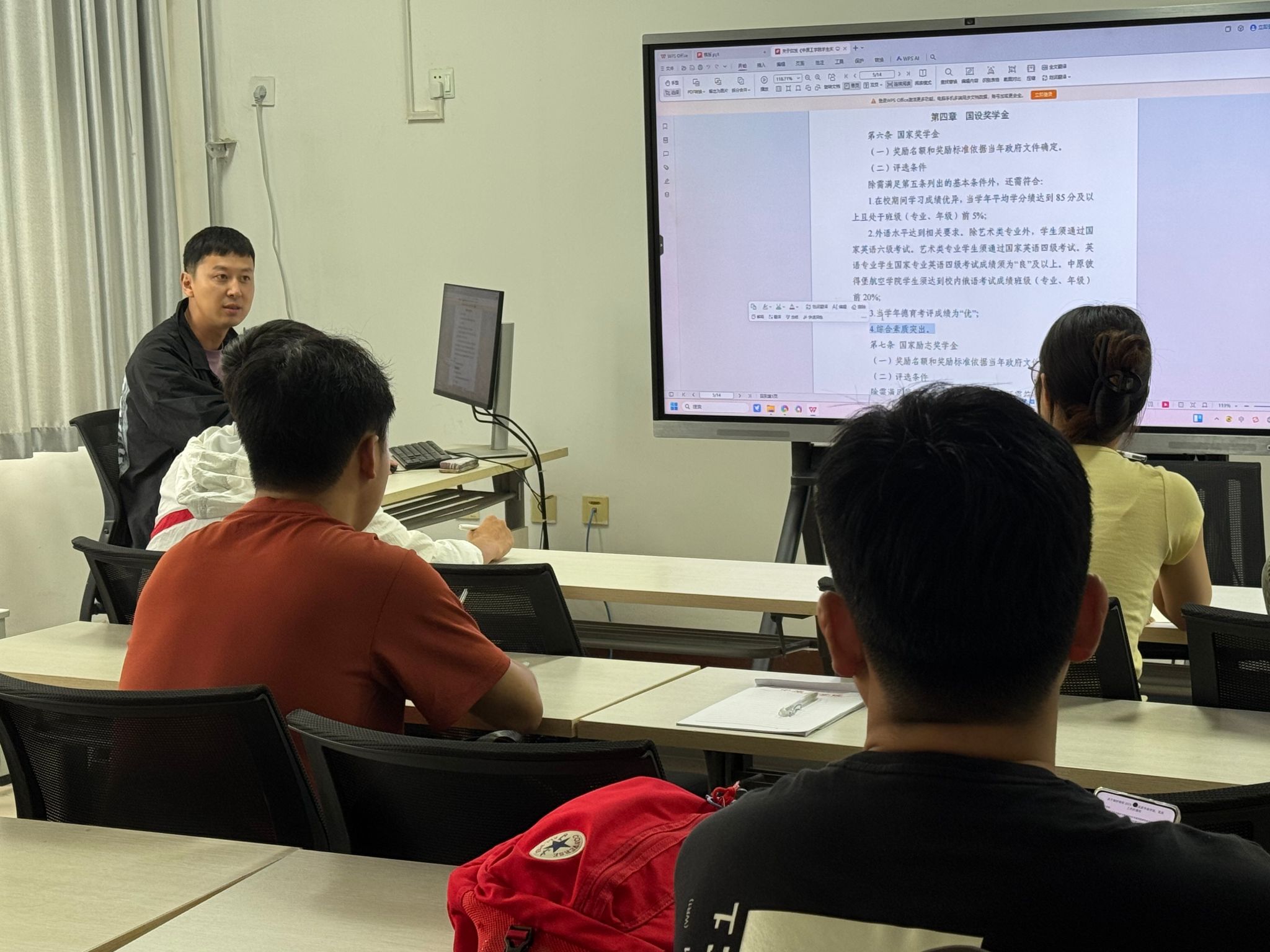 会议着重梳理了奖学金申请全流程规范,从前期材料准备、资格审核到评审公示各环节的操作要点。他强调,评定工作必须严格遵循"公平、公正、公开"原则,确保材料真实、程序合规、结果透明。针对员工干部提出的关于成绩核算、附加分认定等实操问题,现场进行了案例解析和答疑互动,帮助员工干部准确把握政策边界。
