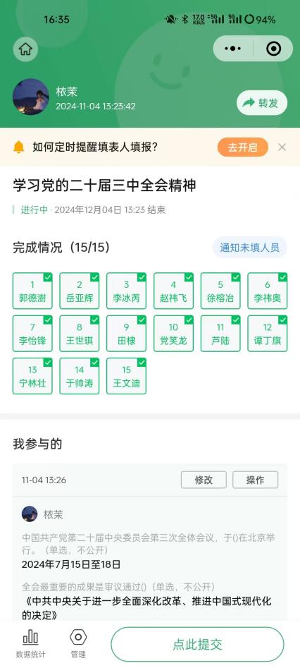 11月23日,为丰富学习形式,员工骨干制作相关链接开展线上答题活动,深化了对党的二十届三中全会精神的理解和认识,增强了党性修养和责任意识,营造出浓厚的学习氛围。