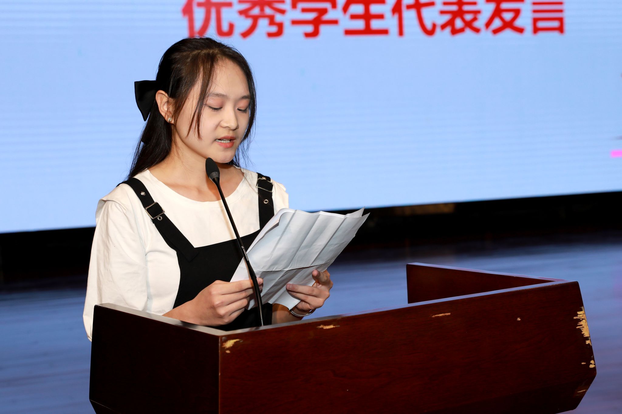优秀员工代表通信222班肖心莲代表在校老生上台发言,她分别从学习和生活这两个方面帮助新生更快适应这里的生活。她表示:对学习要做好合理规划,学好专业课知识,积极动手实践。对生活要培养兴趣爱好,合理作息,建立良好的人际关系。作为老生代表,她将会热心地为新生提供帮助和支持。