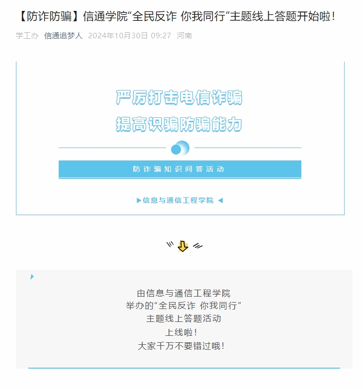 为提高员工反诈意识,以更加简明易懂的方式向大家普及诈骗防范知识,VSport体育官网于2024年10月30日至2024年11月8日举办“全民反诈 你我同行”主题线上答题活动。各年级认真组织,活动截止时共有592名员工参与答题。