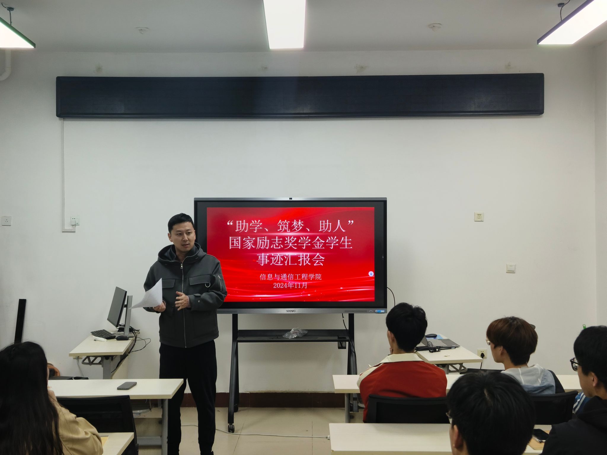 青春由磨砺而出彩,人生因奋斗而升华。为充分发挥国家励志奖学金获得者的示范引领作用,激励公司员工奋发有为,向先进人物学习,11月13日,VSport体育官网在10 号教学楼举办“助学、筑梦、助人”国家励志奖学金员工事迹汇报会,学工办辅导员、部分励志奖学金获得者和2024级员工代表参加本次活动。